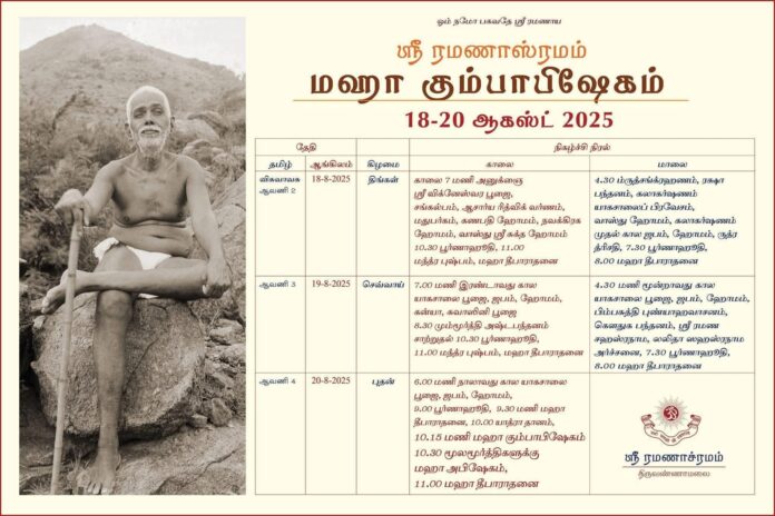 - நிகழ்வின் வர்ணனை: ஸ்ரீ ரமணாஸ்ரமம், திருவண்ணாமலையில் அமைந்துள்ள மாட்ருபூதேஸ்வரர் மற்றும் ஸ்ரீ ரமணேஸ்வரர் மகாலிங்கங்களின் சன்னிதானங்களுக்கு பெருந்தன்மையுடன் மகா கும்பாபிஷேகம் நிகழவுள்ளது. இது 1949-ஆம் ஆண்டு முதல் தொடங்கிய பாரம்பரியமும் ஆன்மீக ரீதியான consecration நிகழ்வுகளின் தொடர்ச்சியாகும்.